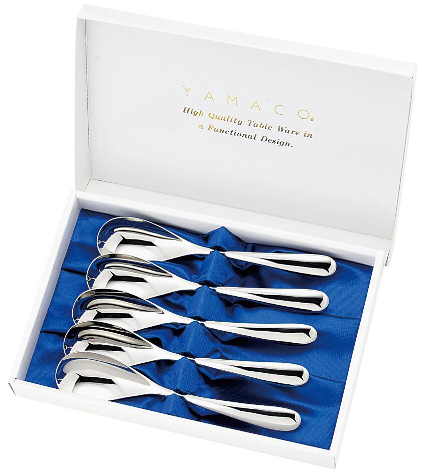 『材質』18-8ステンレス 『セット内容』カレースプーン×5 L 『箱サイズ』245×165×31mm やわらかな流線の戯れに瑞々しさをたたえたフォルム。